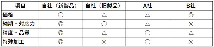 ・納期・対応力:A社・B社は大量生産型のため小ロットの短納期対応が不可(△・×)。当社は〇〇システムにより受注から最短3日で納品可能(◎)。